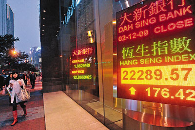 中新網(wǎng)12月3日電 據(jù)香港《文匯報》報道,外圍股市繼續(xù)造好,迪拜世界的陰霾看似消散,加上市場憧憬迪拜世界事件將拖慢各國政府的退市時間表,港股連升第3天,最多曾升326點,午后由于投資者觀望美國3日公布的最新經(jīng)濟(jì)數(shù)據(jù),港股升幅收窄,恒指全日收報22289.5點,升176.4點,成交額783億元,3天已累升逾1100點。