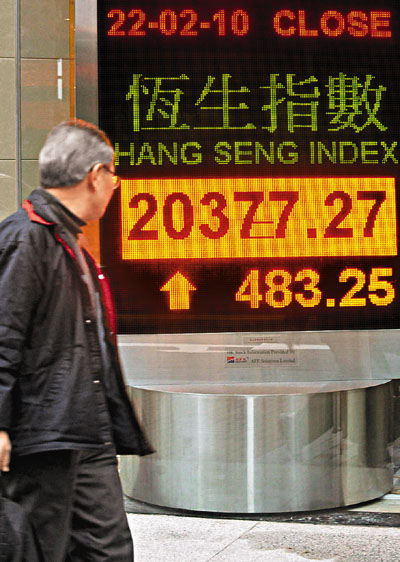 中新網(wǎng)2月23日電 據(jù)香港《文匯報(bào)》報(bào)道,內(nèi)地股市長假期后重開,A股走勢(shì)偏軟,滬深兩市均未能收紅盤。由于香港上周五已經(jīng)大跌,加上下午賣地成績(jī)理想,令恒指22日擺脫A股的羈絆,大市在匯控、中移動(dòng)及一眾地產(chǎn)股上升帶動(dòng)下,重上20000點(diǎn)水平。