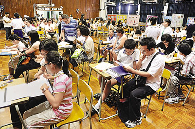 中新網(wǎng)7月8日電 據(jù)香港《文匯報(bào)》報(bào)道,香港今年6.8萬(wàn)名小六生中,成功獲派首三志愿學(xué)生只有85%,較去年下跌3%,余下過(guò)萬(wàn)名小六生希望落空。升中派位7日發(fā)榜后,即掀起一陣瘋狂叩門(mén)潮,不少失意學(xué)生及家長(zhǎng)紛紛把握最后機(jī)會(huì)四出往心儀學(xué)!皳洹睂W(xué)位,多間英中、名牌中中及直資中學(xué)也逼滿心急如焚的人潮。