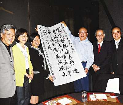 會(huì)上,梁美芬送了一幅字畫給胡志強(qiáng)作見面禮,上面寫有她創(chuàng)作的一首賦:“寬寬暢暢通海峽、連連延延香江情、和和平平謀共識(shí)、安安樂樂創(chuàng)繁榮”。胡志強(qiáng)也禮尚往來,充分發(fā)揮其幽默本色,說“從政就是要所有人快樂”。