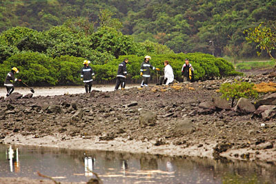 消防員趕至,帶備木板和鐵鏟往救人,步出10多米后已身陷泥灘,10多名消防員遂改以匍匐前進方式靠近,花約1小時終掘開兩名事主身邊瘀泥,將他們救出帶回路邊。兩名事主無受傷,但與消防員一樣滿身泥濘,要出動消防喉沖洗身體,及后自行離開。