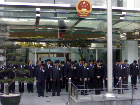 早上9時許,行政長官曾蔭權(quán)率領(lǐng)一眾官員,包括政務(wù)司司長唐英年、財政司司長曾俊華、律政司司長黃仁龍,以及一眾司局長及其它官員,在政府總部廣場外,默哀1分鐘,以悼念青海地震遇難同胞。