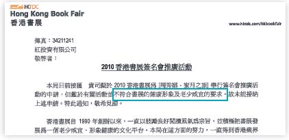 據(jù)香港明報(bào)報(bào)道,書(shū)展今屆共收到約130多宗簽名活動(dòng)申請(qǐng)。貿(mào)發(fā)局傳媒及公關(guān)部發(fā)言人張志輝表示,“香港書(shū)展文化活動(dòng)顧問(wèn)團(tuán)”大半年前已成立,成員來(lái)自文化、出版、教育和傳媒界共13人,昨經(jīng)過(guò)早上開(kāi)會(huì)后,決定拒絕不超過(guò)10宗簽名會(huì)申請(qǐng)。