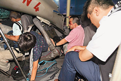 由于沖擊力度猛烈,意外后小巴車頭陷入堅硬貨柜尾,司機首當其沖奄奄一息;車廂內(nèi)多排座椅椅腳斷開,座位向前傾倒,部分乘客如“三明治”般人疊人受困,其余乘客則被拋離座位撞傷。同時,車頭引擎開始冒出火舌及濃煙,全車人危在旦夕。