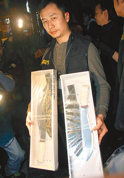 為防黑幫再作街頭火拼,油尖警區(qū)反黑組先發(fā)制人,27日凌晨1時許根據(jù)線報,掩至漆咸道南一間私人會所搜查,搗破黑幫武器庫,檢獲兩柄染有血漬開山刀及三支長電筒,以涉嫌藏有攻擊性武器罪拘捕何姓、24歲會所負責人,并會檢驗利刀有否涉及血案。