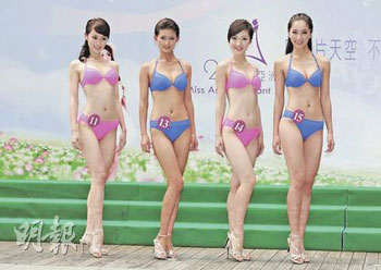 中新網(wǎng)10月15日電 據(jù)香港《文匯報(bào)》報(bào)道,2009年亞洲小姐選舉候選佳麗14日在香港荃灣一間酒店以泳裝在池畔與傳媒見面,但2號(hào)王,幓忌蠚夤苎兹毕挥18位佳麗亮相。大會(huì)安排佳麗穿上比基尼泳裝,各佳麗身裁都顯得突出。