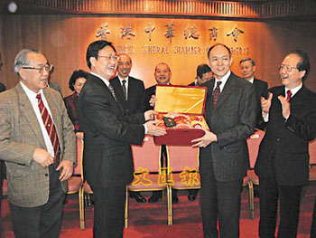 中總霍震寰會(huì)長(zhǎng)以及林廣兆、張成雄、陳幼南、林銘森副會(huì)長(zhǎng)及多位常董、會(huì)董與來(lái)賓座談,并設(shè)晚宴歡迎李春明副省長(zhǎng)一行;粽疱緯(huì)長(zhǎng)與林廣兆副會(huì)長(zhǎng)均表示,中博會(huì)是信息交流的重要平臺(tái),是世界了解中部地區(qū)發(fā)展的窗口,香港工商界都十分重視。中總長(zhǎng)期以來(lái)與香港工商界以及世界華商保持緊密聯(lián)系,可以協(xié)助湖北省政府發(fā)布中博會(huì)信息。
