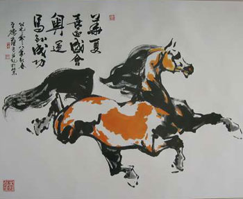 此畫描繪了一匹奔騰向前的駿馬,頗具“馬踏飛燕”雄風。繪畫的技法雖屬中國筆墨寫意,但馬的比例結(jié)構(gòu)卻是精準的良馬相,顯示出作者廣博的馬學(xué)知識及深厚的藝術(shù)功力。畫面行書題款為“華夏喜迎盛會,奧運馬到成功”,表達了中國人民此時此刻的美好心愿。馬身上的花斑中,細看有一幅中國地圖,更是明白無誤地象征著中華騰飛之意。