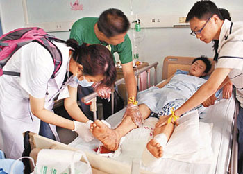 男孩傷在腳底,大大小小的有很多傷口,左腳更有一塊長(zhǎng)約10厘米的縫針傷口。見到男孩,尹淑玲先側(cè)身一笑,說(shuō):“大男孩,換繃帶或會(huì)很痛啊!闭f(shuō)完便俯身利索地替他拆換繃帶。