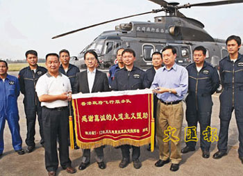 中新網(wǎng)6月6日電 據(jù)香港文匯報(bào)報(bào)道,一直在四川執(zhí)行飛行救援任務(wù)的香港飛行服務(wù)隊(duì)在向清平災(zāi)區(qū)運(yùn)送完1.2噸物資后,救援工作暫告完成。據(jù)統(tǒng)計(jì),飛行隊(duì)在過去20天成功救出96名受困災(zāi)區(qū)民眾。四川省人民政府5日在廣漢機(jī)場(chǎng)特贈(zèng)錦旗以表彰飛行隊(duì)在川的優(yōu)異表現(xiàn)。