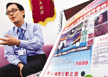 中旅社業(yè)務(wù)部副總經(jīng)理吳熹安表示,四川省旅游局宣布部分旅游景點(diǎn)恢復(fù)接待游客,故集團(tuán)實(shí)時(shí)推出低至7折、團(tuán)費(fèi)由1699元起的四川4天優(yōu)惠團(tuán),另推出團(tuán)費(fèi)2799元的5天愛心關(guān)懷團(tuán),行程除了傳統(tǒng)的樂山、峨眉山外,亦安排團(tuán)員參觀地震災(zāi)區(qū)民眾暫住的“溫馨家園”,讓團(tuán)員向四川人民送暖。