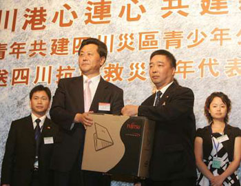 主禮嘉賓、中聯(lián)辦副主任李剛向18個(gè)重災(zāi)縣青年志愿者組織贈送了抗震救災(zāi)辦公設(shè)備,以協(xié)助災(zāi)區(qū)重建。