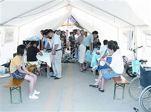 中德紅十字會野戰(zhàn)醫(yī)院是以野戰(zhàn)規(guī)模由中國和德國紅十字會在5月26日聯(lián)合建立,整個醫(yī)院以多個帳篷組成各個醫(yī)療科室,包括有內(nèi)外婦兒科的門診和住院病房,也設(shè)有重癥監(jiān)護(hù)室、手術(shù)室、產(chǎn)房、藥房、檢驗(yàn)室、X光室和其它后勤科室等。