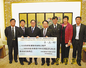 日前港協(xié)暨奧委會(huì)會(huì)長霍震霆、副會(huì)長余國梁、義務(wù)秘書長彭沖及義務(wù)副秘書長王敏超,攜同捐款支票到中聯(lián)辦,由中聯(lián)辦副秘書長王志民、宣傳文體部副部長陳亞瓊及李冰接受,將全數(shù)捐款轉(zhuǎn)交“中央政府駐港聯(lián)絡(luò)辦賑災(zāi)專戶”,幫助四川災(zāi)區(qū)人民。