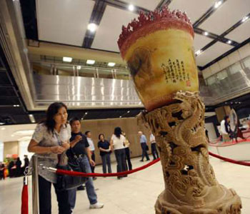 香港首屆紫荊花杯國際文化藝術博覽會19日起至21日在香港展覽中心舉行,展出280件全國各地名師名家的陶瓷以及字畫作品,國家青瓷泰斗徐朝興的成名珍藏作品三環(huán)瓶,白瓷領軍人物蘇清河的代表作品魚籃觀音,還有描繪國務院總理溫家寶指揮抗震救災的油畫等,均是出現在此次博覽會的藝術珍品。