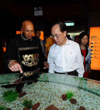 曾蔭權(quán)還到了“金魚寶典”一睹全球最大的黑獅頭金魚,他在金魚愿望樹上寫上愿望,意指海洋公園全球第一。