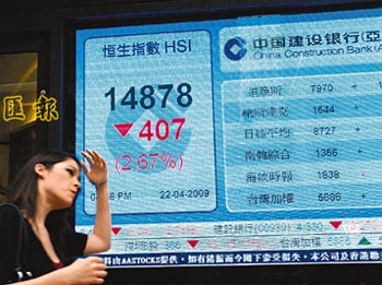 中新網(wǎng)4月23日電 據(jù)香港《文匯報(bào)》報(bào)道,港股經(jīng)周二轉(zhuǎn)勢(shì)后,22日繼續(xù)下跌,終跌破15000點(diǎn)。大市在上午曾一度上升,但午后內(nèi)地上證綜指急插水3%,拖累港股表現(xiàn),淡友趁勢(shì)發(fā)惡,午市大插400點(diǎn)的頹勢(shì),相信嚇怕不少散戶,尤其下午開(kāi)市首15分鐘便挫近260點(diǎn)。恒指收?qǐng)?bào)14878點(diǎn),跌407點(diǎn),跌幅2.7%。