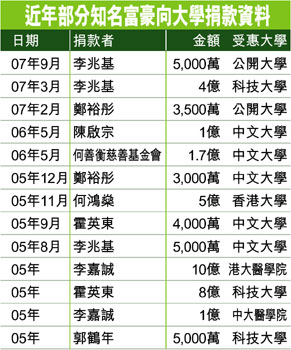 李兆基今次的捐款,未能打破長(zhǎng)實(shí)集團(tuán)主席李嘉誠(chéng)于○五年捐出十億元予港大所創(chuàng)下的紀(jì)錄;嘉道理家族及賭王何鴻燊 ,亦曾分別捐出五億元予港大。