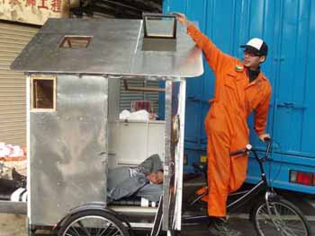中新網(wǎng)1月4日電 露宿者流離失所,受城市發(fā)展所逼欲找尋“有瓦遮頭”暫住亦難度甚大。理大設(shè)計(jì)學(xué)院環(huán)境及室內(nèi)設(shè)計(jì)系助理教授黃國(guó)才就設(shè)計(jì)了一車(chē)多用的“流浪三輪車(chē)屋”,內(nèi)里可居住、閱讀及保管財(cái)物,除令露宿者有藏身之所外,亦方便他們踏著三輪車(chē)尋找每日不同的居住地方。