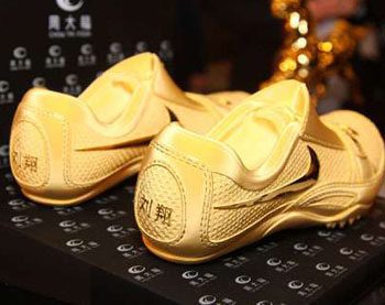 除黃金磚墻外,另一個(gè)焦點(diǎn)是劉翔黃金跑鞋,以純金打造的“黃金跑鞋”,其原形來自劉翔在洛桑破紀(jì)錄時(shí)所穿的跑鞋,長26厘米,以實(shí)物原大小一比一打造,黃金重約16兩,約值港幣238000元。制作需時(shí),由于跑鞋的紋理十分多,以及非常復(fù)雜,單是制作蠟?zāi)R呀?jīng)需時(shí)40天,黃金跑鞋總共需時(shí)2個(gè)月才完成。