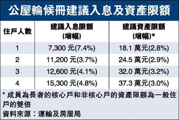 加上參考非住屋開支增幅后,房署建議提高輪候冊(cè)入息及資產(chǎn)限額,平均增幅5.5%及3.1%。單身人士入息限額由現(xiàn)在月入6800元,建議調(diào)升為7300元,增幅達(dá)7.4%,資產(chǎn)限額建議由現(xiàn)在17.6萬(wàn)元,調(diào)升為18.1萬(wàn)元。4人家庭入息限額就建議增為15300元,增幅4.8%,資產(chǎn)限額建議加至37.3萬(wàn)元。