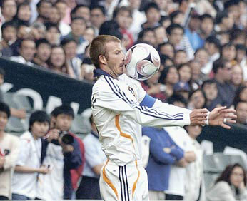 在上海站拉傷右腿的貝克漢姆9日仍以正選上陣,踢足90分鐘,包辦所有角球及罰球,也不時(shí)在右路施展“七旋斬”威力,每逢貝克漢姆一拿球,即引來球迷狂呼,有的更大喊“David!David!”。