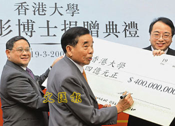 有關(guān)支票捐贈(zèng)儀式19日于港大舉行,除鄭裕彤外,港大校務(wù)委員會(huì)主席馮國經(jīng)、校長徐立之、法律學(xué)院院長陳文敏等均有出席。馮國經(jīng)贊揚(yáng)鄭裕彤一直對教育事業(yè)大力支持,這次捐贈(zèng)也是對港大每一成員的鼓勵(lì),他對此深表感激。徐立之則指,鄭裕彤的捐款除支持港大“百周年校園”計(jì)劃外,也有點(diǎn)名支持法律學(xué)院,對學(xué)院發(fā)展幫助甚大。