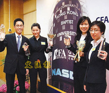 中新網(wǎng)5月13日電 據(jù)香港文匯報(bào)報(bào)道,投資炒股是香港市民生活的一部分,近年更涌現(xiàn)出不少年輕“股神”。香港浸會(huì)大學(xué)工商管理學(xué)院4位本科生通過7個(gè)月的多輪比賽,打敗全球79隊(duì)參加者,是香港學(xué)生首次奪得在紐約舉行的“全球投資分析比賽”總冠軍。