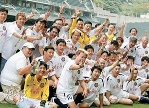 香港不少團(tuán)體18日為四川地震災(zāi)民籌款,明星足球隊(duì)(圖)在大球場(chǎng)舉行慈善賽,與由警隊(duì)“一哥”鄧竟成助陣的足總邀請(qǐng)隊(duì)友賽。(圖片來源:明報(bào))
