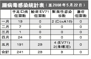 中新網(wǎng)5月23日電 據(jù)澳門日報報道,澳門衛(wèi)生局公布,22日再接獲4例腸病毒病例報告,截至22日中午,澳門今年累計錄得241個腸病毒(手足口病/皰疹性咽峽炎)病例。