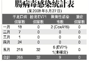 中新網(wǎng)5月28日電 據(jù)澳門(mén)日?qǐng)?bào)報(bào)道,澳門(mén)衛(wèi)生局27日再接獲3例腸病毒病例報(bào)告,截至27日中午,澳門(mén)今年累計(jì)錄得266個(gè)腸病毒(手足口病皰疹性咽峽炎)病例,無(wú)接獲腸病毒感染聚集性感染個(gè)案。