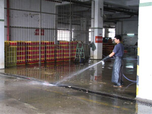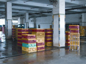 圖:工人清洗批發(fā)市場內(nèi)設(shè)施及使用過的膠籠。(圖片來源:澳門日報(bào))