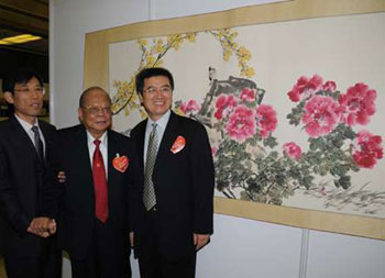 曾憲梓在覓得“心頭好”后顯得十分滿意,并與《國(guó)色天香》合照。在場(chǎng)記者問他為何選購《國(guó)色天香》,曾憲梓回應(yīng)說,“牡丹花嘛!”詹庚西在這次展覽共有兩幅義賣作品,分別為《國(guó)色天香》和《高瞻遠(yuǎn)矚》。