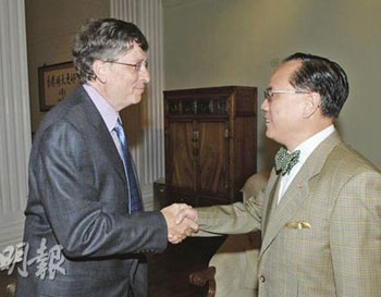 蓋茨12日不忘大贊北京奧運(yùn)開(kāi)幕式“精彩”。他訪港首個(gè)行程是會(huì)見(jiàn)行政長(zhǎng)官曾蔭權(quán),討論信息科技界如何與特區(qū)政府在改善教育、推動(dòng)數(shù)碼共融、實(shí)現(xiàn)數(shù)碼21發(fā)展藍(lán)圖等方面合作。蓋茨晚上發(fā)表題為“下一個(gè)十年的創(chuàng)新科技”演說(shuō),并與香港3間大學(xué)校長(zhǎng)包括香港大學(xué)徐立之、中文大學(xué)劉遵義、科技大學(xué)朱經(jīng)武對(duì)談。