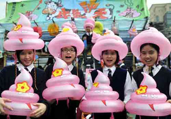 張祝珊英文中學(xué)第三度出戰(zhàn)維園年宵,兩班中四商科同學(xué)約60人,投資約7萬(wàn)元售賣(mài)1500頂“牛屎帽”。同學(xué)們穿上校服、戴上自己的創(chuàng)意產(chǎn)品叫賣(mài),數(shù)字同學(xué)還齊聲發(fā)出祝福呼聲:“牛氣沖天”,并說(shuō)“牛屎等如牛市”,在股市疲弱下,這番話(huà)令股民特別醒神。