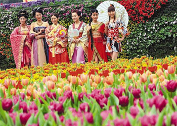 今年花展設(shè)有多個別致景點(diǎn),包括以超過1.5萬株郁金香鋪設(shè)而成的逾190平方米的圓形花海,主辦方還首次設(shè)立T形觀景花臺,本星期六、日還有兩場以體育服裝及婚紗為主題的時裝表演。