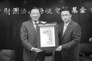 考察團(tuán)團(tuán)長李偉杰向江丙坤致送紀(jì)念品。(圖片來源:澳門日?qǐng)?bào))