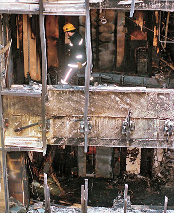 大火撲滅后,消防員進(jìn)入火場調(diào)查。(圖片來源:蘋果日報(bào))