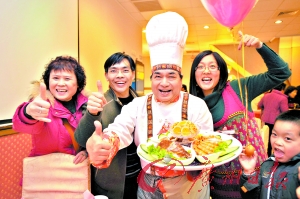 “各位貴賓,大家好,非常榮幸能在中華民族最重視的傳統(tǒng)佳節(jié)里,為大家準(zhǔn)備臺(tái)灣地區(qū)傳統(tǒng)的‘圍爐’,現(xiàn)在我開始為大家上菜,這道菜里有鮑魚,還有醉蝦……”昨晚6時(shí)剛過,臺(tái)北“頂廚國宴”餐廳的廚藝總監(jiān)黃德忠身著喜慶的廚師服,親自為廣之旅的四桌游客端上了年夜菜肴。