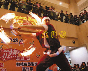 據(jù)香港文匯報報道,25日天水圍商場嘉湖銀座舉行了“圣誕火熱勁舞show”,邀請來自澳洲的火焰舞蹈團到香港表演。3人組成的表演隊伍手持煙火,做出一系列高難度動作,包括跳舞、噴火、玩呼拉圈和踩高蹺,吸引在場大批小朋友拍手大笑和爭相與他們合照。