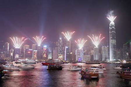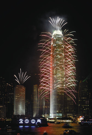 二十三時(shí)五十九分,行政長官曾蔭權(quán)在尖沙嘴文化中心啟動(dòng)倒計(jì)時(shí)儀式。二00七年的最后二十秒,國金二期北面外墻兩側(cè)由三十二層起依次向上燃放焰火,火樹銀花照耀整個(gè)維港;合和中心、AIG大廈、長江集團(tuán)中心及東企業(yè)廣場四棟大廈,外墻同時(shí)顯示倒計(jì)時(shí)時(shí)間,停泊在維港的滅火輪則向海面噴射多樣的水花……