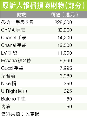唐仔細(xì)羅列37項(xiàng)受損財(cái)物,其中以衣物為主,包括價(jià)值50元的內(nèi)衣及成衣品牌Baleno出品的T恤;另外的名貴財(cái)物包括接近4000元的茅臺(tái)酒、勞力士、Chanel及CYMA等4只名表,所有財(cái)品總值36.6萬(wàn)元。此外,唐的一塊載有婚宴來(lái)賓簽字的紅布,以及數(shù)項(xiàng)衣物亦損壞,但價(jià)值有待確定。