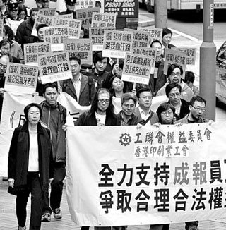 據(jù)香港文匯報(bào)報(bào)道,23日早約30名《成報(bào)》前員工由中環(huán)遮打花園出發(fā),一邊高叫口號(hào),一邊游行到政府合署的律政司司長(zhǎng)辦公室,要求律政司酌情發(fā)出禁制令禁止《成報(bào)》出版。其后獲律政司政務(wù)專員何淑兒代表接收請(qǐng)?jiān)感牛约吧逃懡鉀Q方法。