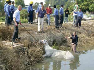 3名獸醫(yī)稍后到場給它注射鎮(zhèn)靜劑后,白馬失去反抗能力被拉上岸,再接受一次注射后,神志恢復正常,事件擾攘約個多小時后,“曉康”被送返馬場,經(jīng)檢驗后并無受傷。