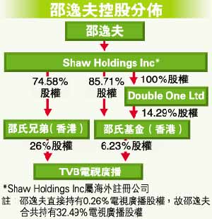 目前邵逸夫透過邵氏兄弟(上市公司)、邵氏基金及個人直接持有,合共持有電視廣播32.49%股權。若有買家對電視廣播有興趣,可向邵氏直接購入電視廣播股權,或收購市值較低的邵氏兄弟,達至以較低成本間接控制電視廣播。