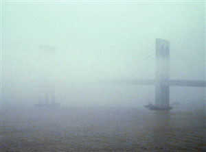 圖:西灣大橋被霧靄包圍,如從中“斷開(kāi)”。(圖片來(lái)源:澳門(mén)日?qǐng)?bào))