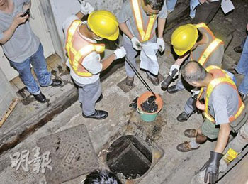 但街坊稱(chēng),兇案現(xiàn)場(chǎng)樓下的地產(chǎn)鋪和牛仔褲鋪的污水渠,近日傳出如“死老鼠“般惡臭。渠務(wù)署職員8日與探員到石硤尾現(xiàn)場(chǎng)一帶的沙井搜查,探員倒入化學(xué)顯影劑后利用弧光燈搜索,撈起兩團(tuán)懷疑碎肉,又收集了4盆淤泥,全部帶返警署調(diào)查。