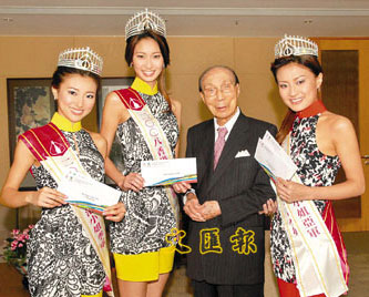 邵逸夫爵士頒獎給三位港姐得獎佳麗。(圖片來源:文匯報)
