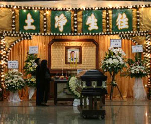 靈堂設(shè)于世界殯儀館一樓世界堂,布置莊嚴肅穆,靈堂正上方懸掛著“往生凈土”的橫幅,兩旁是“浩氣長存、哲人其萎”的挽聯(lián),下方擺放了蘇志豪生前的軍裝遺像,兩旁擺放著親屬敬獻的花籃,靈堂四周圍著白布,擺滿各界人士敬獻的花圈,兩輛紙扎警隊電單車放在靈堂旁邊。