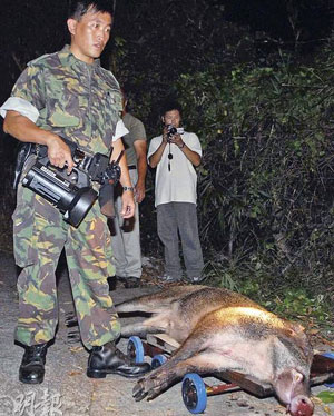 中新網(wǎng)9月19日電 據(jù)香港大公報報道,18日,一頭野豬闖入香港元朗牛潭尾民居,爆發(fā)“人豬大戰(zhàn)”。一頭重200斤的野豬進村覓食時受驚,誤闖村屋空地,戶主及街坊等四人分持斧頭、犁耙合力捕捉,結(jié)果三人受傷,最后將野豬困鎖在廁所。警員接報趕至封鎖現(xiàn)場,狩獵隊入村將野豬射殺。